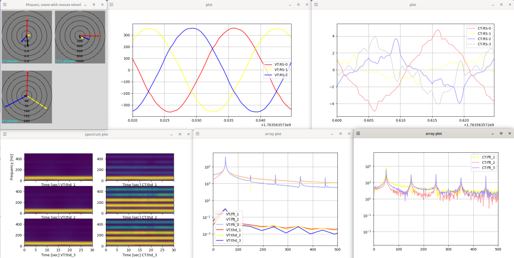 The sensors offer a rich set of basic measurements (U,I,P,Q,Freq) which are available for direct inspection and can easily be used as input to advanced algorithms and/or local/external databases for analytics. We created a number of python scripts to analyse the signals in real time, see the figure below with phasors, voltage/current signals, harmonics spectrum, and FFTs. One of these scripts stores measurements of any DSP in influxdb such that they can visualized with web dashboards such as Grafana.
